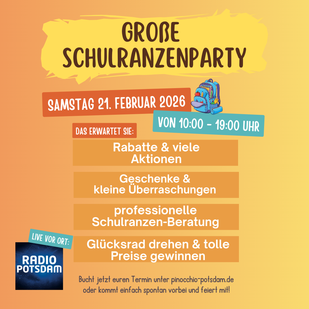 Am 21.Februar feiern wir unsere große Schulranzenparty. Lasst euch professionell beraten, macht euern Füllerführerschein, dreht am Glücksrad und feiert mit. Live mit Radio Potsdam freuen wir uns auf euern Besuch.